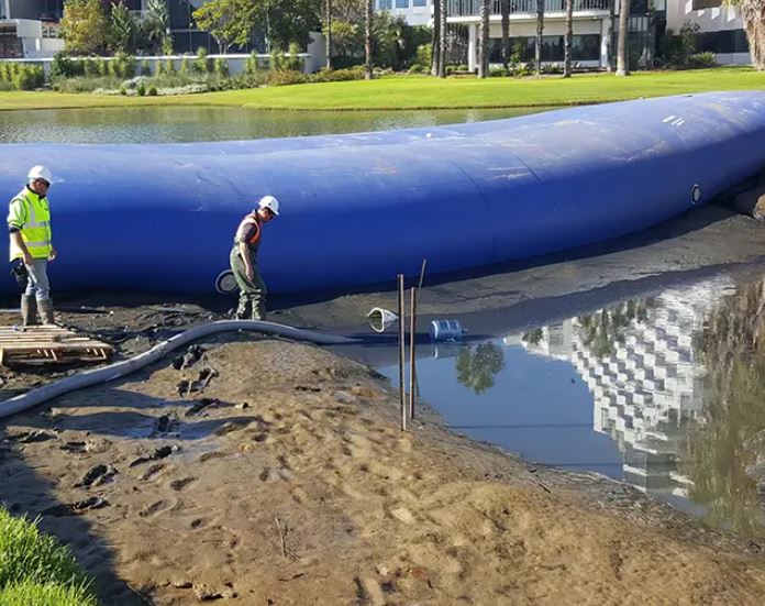 充水式围堰坝袋是一种充水式拦水屏障,可充当拦水坝或临时围堰,用于河流改道、河道清淤以及针对船用坡道,船舶码头及池塘衬垫的修缮工作进行排水。亦具备极佳的防洪性能,其效果优于沙袋和其他防洪设备。充水式围堰坝袋对环境影响小,具备环保特性,可用于引水、排水、防洪、河道修复、有害物质控制及蓄水储水。